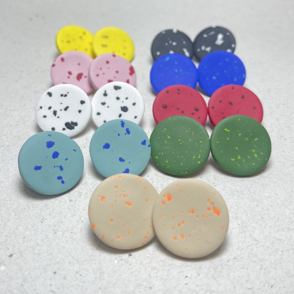 Entdecken Sie eine verspieltere Version des minimalistischen Stils mit diesen Ohrringen aus Polymer Clay mit dezentem Splash-Effekt. Die klassische runde Form wird mit lebendigen Farbsprenkeln kombiniert und schafft einen modernen und zugleich künstlerischen Look.
