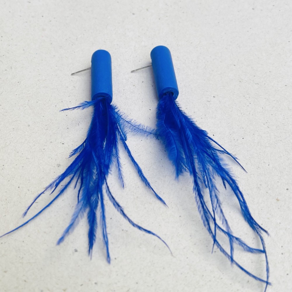 Μια τολμηρή προσθήκη στη συλλογή σας: γεωμετρική απλότητα στο επάνω μέρος, παιχνιδιάρικη υφή φτερού στο τελείωμα. Χειροποίητα και μοναδικά, αυτά τα σκουλαρίκια χαρίζουν ένταση και χαρακτήρα σε κάθε σας εμφάνιση.
