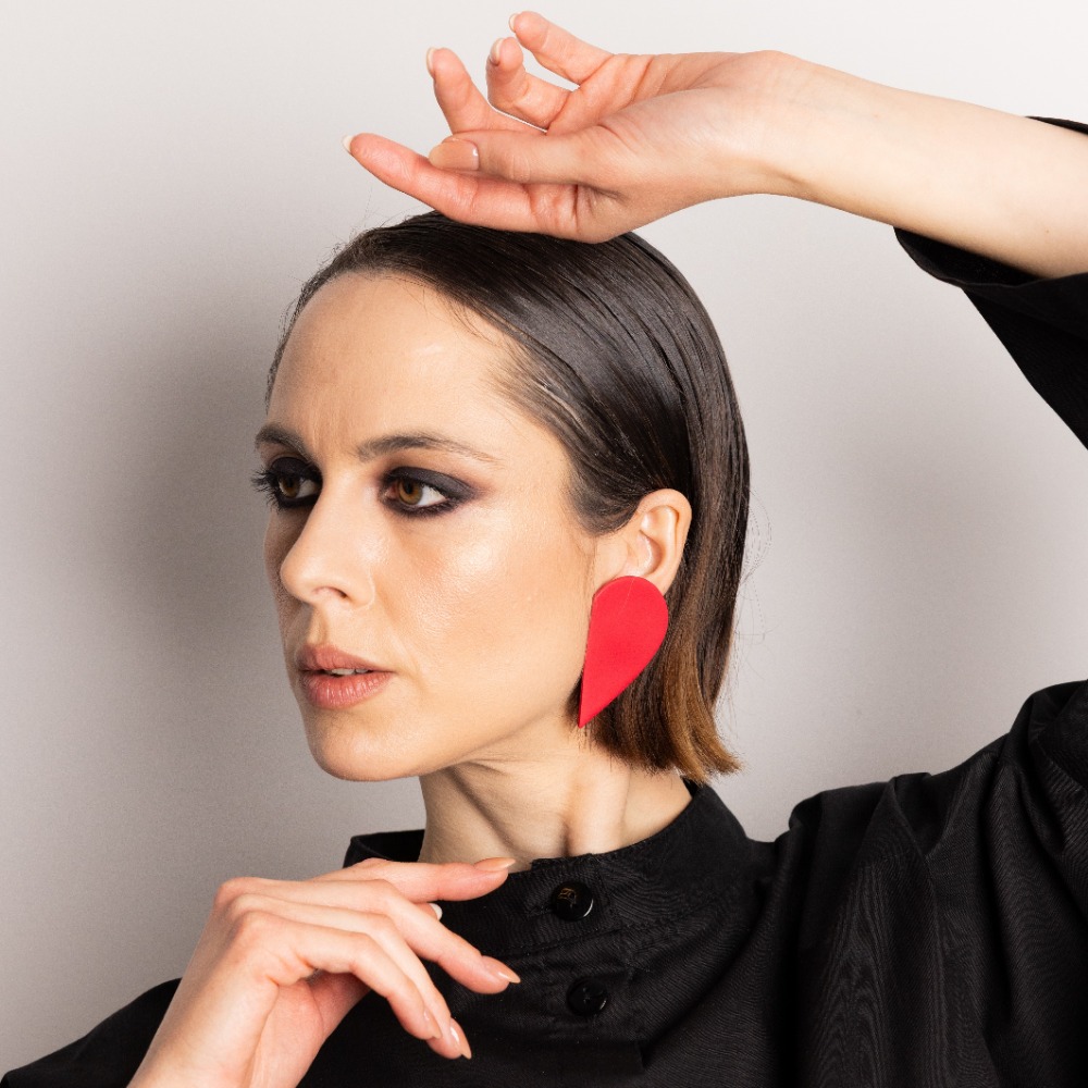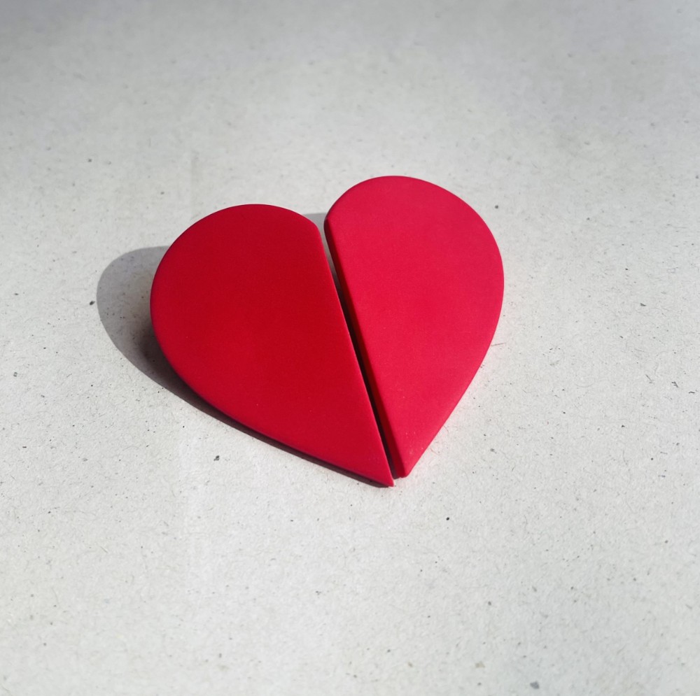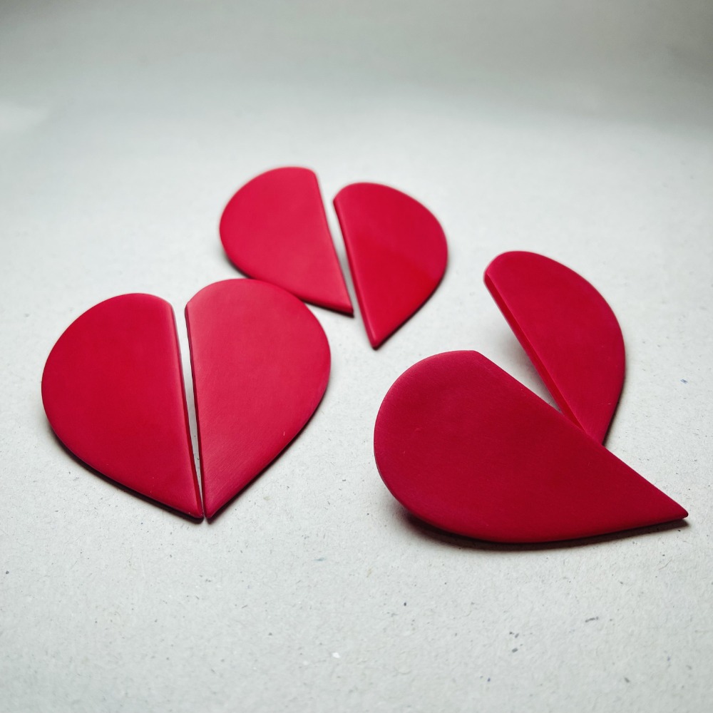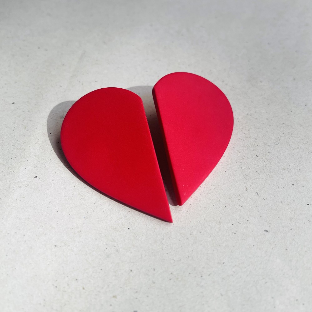 Μια καρδιά χωρισμένη σε δύο κομμάτια — κάθε σκουλαρίκι είναι το ένα μισό — μαζί σχηματίζουν μια ολοκληρωμένη καρδιά