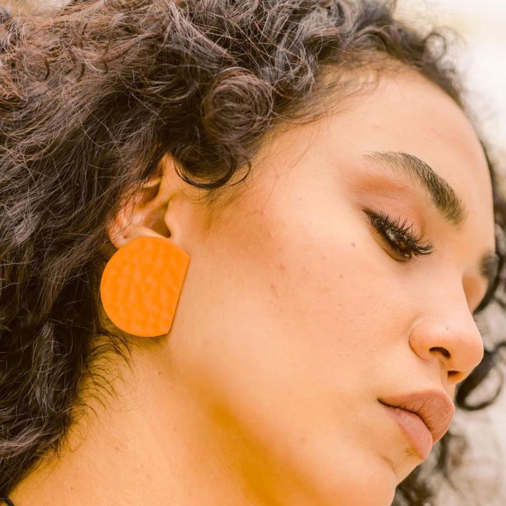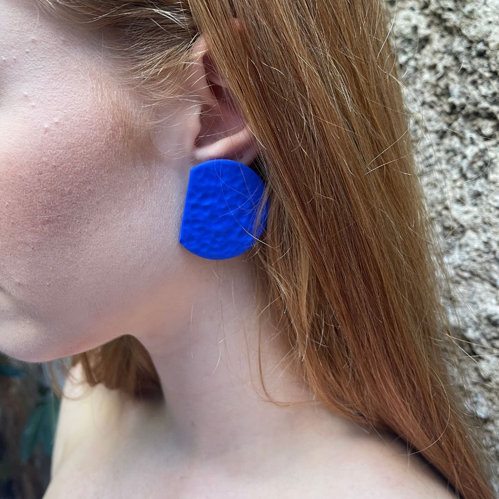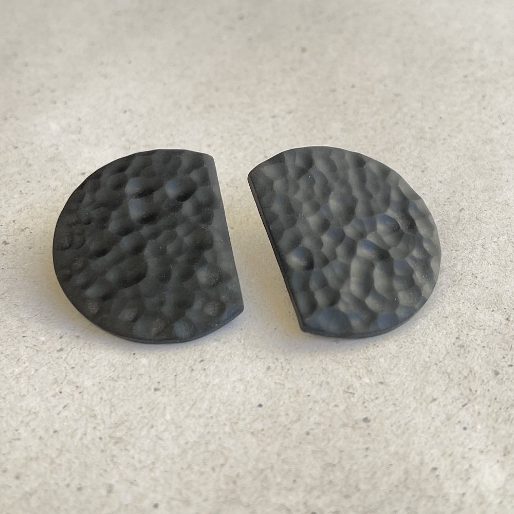 Με ημικυκλικό σχήμα και διακριτικές ανάγλυφες λεπτομέρειες, αυτά τα σκουλαρίκια συνδυάζουν αρμονικά το χρώμα με την απλότητα.