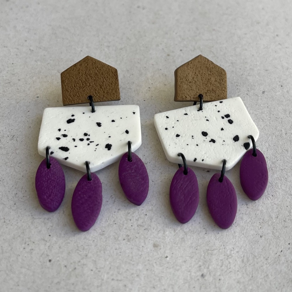 Με χρωματική αντίθεση, speckled λεπτομέρειες και πολυμορφική γεωμετρία, αυτά τα σκουλαρίκια είναι μικρά έργα τέχνης για τα αυτιά σας. Χειροποίητα από πολυμερικό πηλό, είναι ιδανικά για εμφανίσεις με χαρακτήρα.