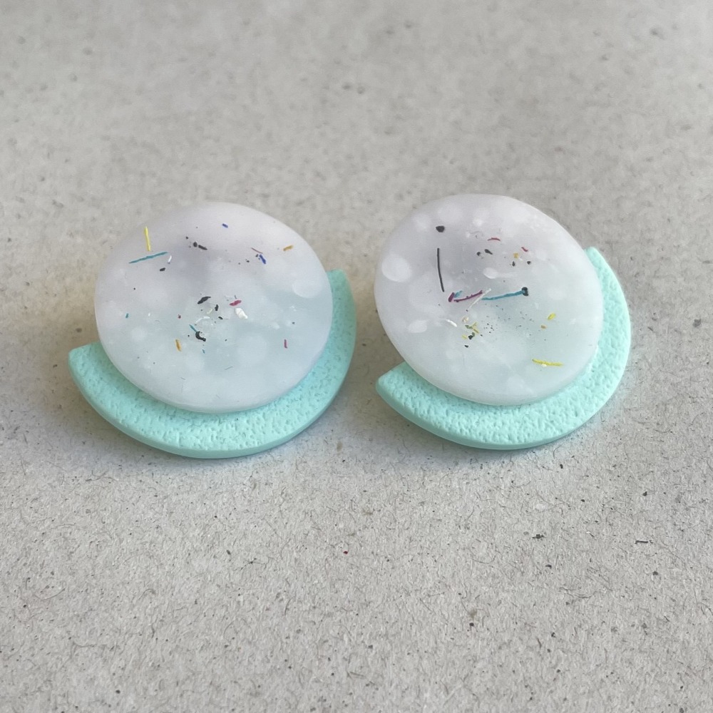 Μοντέρνα και παιχνιδιάρικα, αυτά τα σκουλαρίκια ξεχωρίζουν με τον κυκλικό σχεδιασμό τους και τις πινελιές "confetti" στο λευκό στοιχείο. Η χρωματική βάση προσθέτει αντίθεση και στυλ, ενώ η ανάλαφρη κατασκευή τα κάνει ιδανικά για καθημερινή χρήση.
