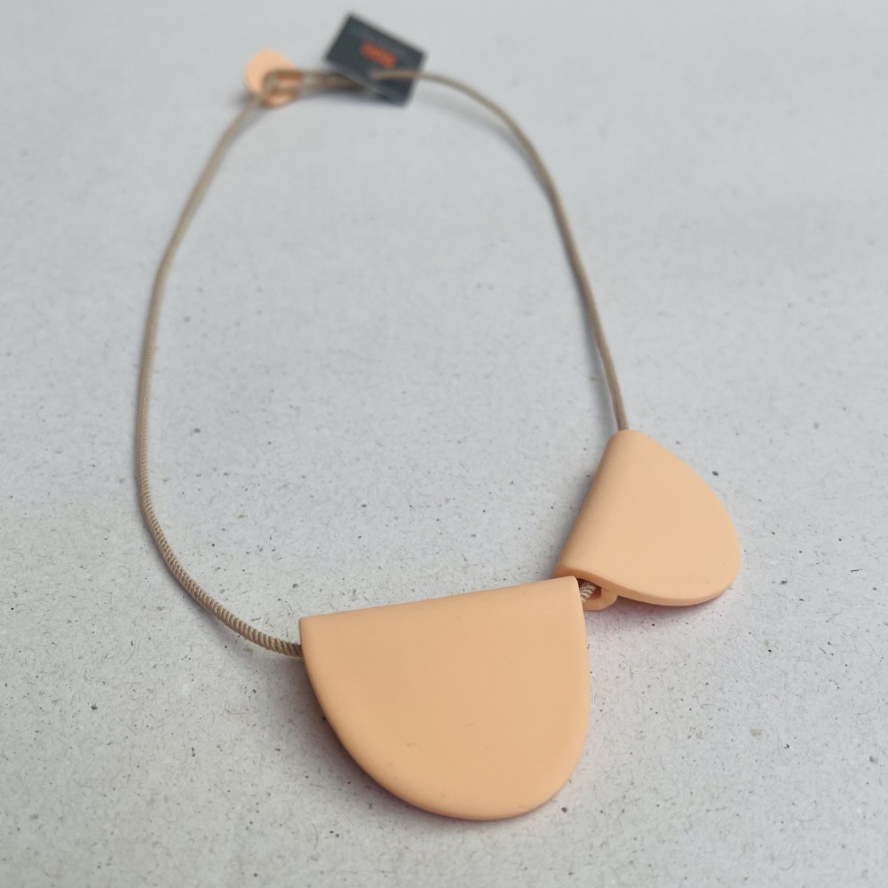 Δύο ημικυκλικά στοιχεία, διαφορετικού μεγέθους, περνούν διακριτικά σε ένα λεπτό κορδόνι μακραμέ, δημιουργώντας μια αρμονική αλλά ασύμμετρη σύνθεση. Το κολιέ είναι εξαιρετικά ελαφρύ και ολοκληρώνεται με χειροποίητο κούμπωμα από πηλό, για άνετη και σταθερή εφαρμογή.